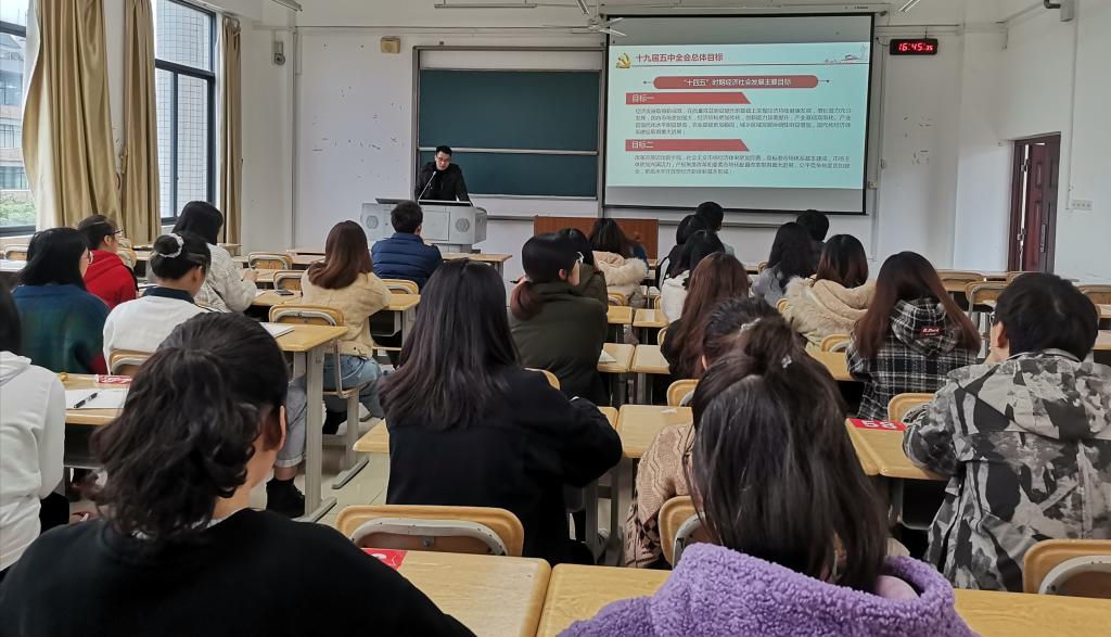 为深入学习贯彻党的十九届五中全会精神,2020年11月25日下午,数学与统计学院学生第二党支部在格致楼301教室开展学习贯彻党的十九届五中全会精神专题学习会。学院党总支副书记、学生第二党支部书记张明进主讲。
