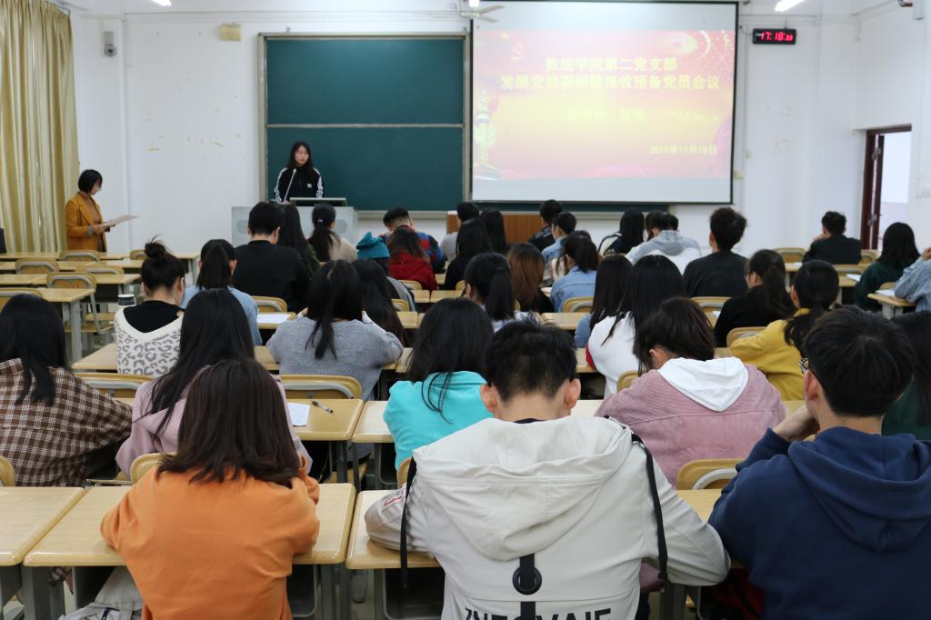 2019年11月22日下午,数学与统计学院第二党支部在格致楼301教室召开发展党员答辩暨接收预备党员会议。本次会议由第二党支部副书记罗曼主持,会议就陈香林、贺倩2名发展对象是否接收为预备党员进行讨论,第二党支部师生党员及入党积极分子代表参加会议。
