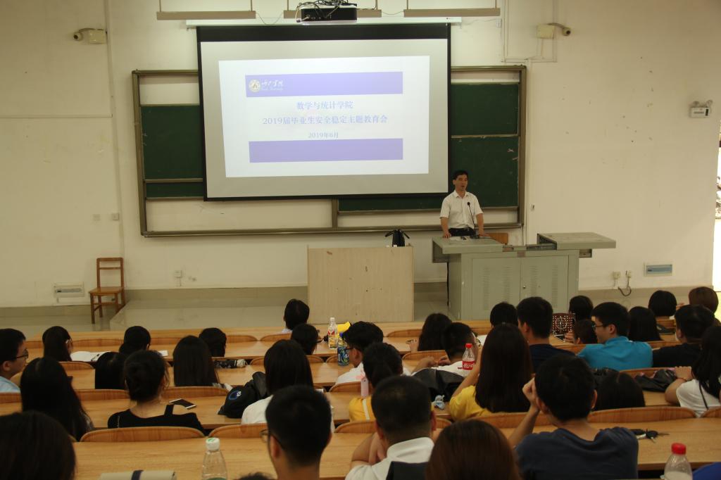 6月3日下午,数学与统计学院于弘毅楼1-102教室召开了2019届毕业生安全教育大会。党院总支书记黄星寿、院长罗日才、辅导员姚宁及2019届全体毕业生参加了会议。会议由学院团委书记罗曼主持。