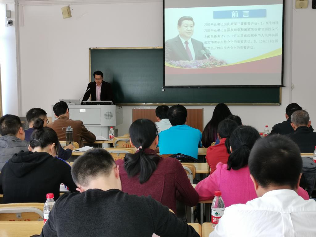 2019年10月30日下午,数学与统计学院全体教职工于西区格致楼710教室集中学习了习近平总书记国庆期间三篇重要讲话精神。学习会由数学与统计学院党总支副书记张明进主讲。