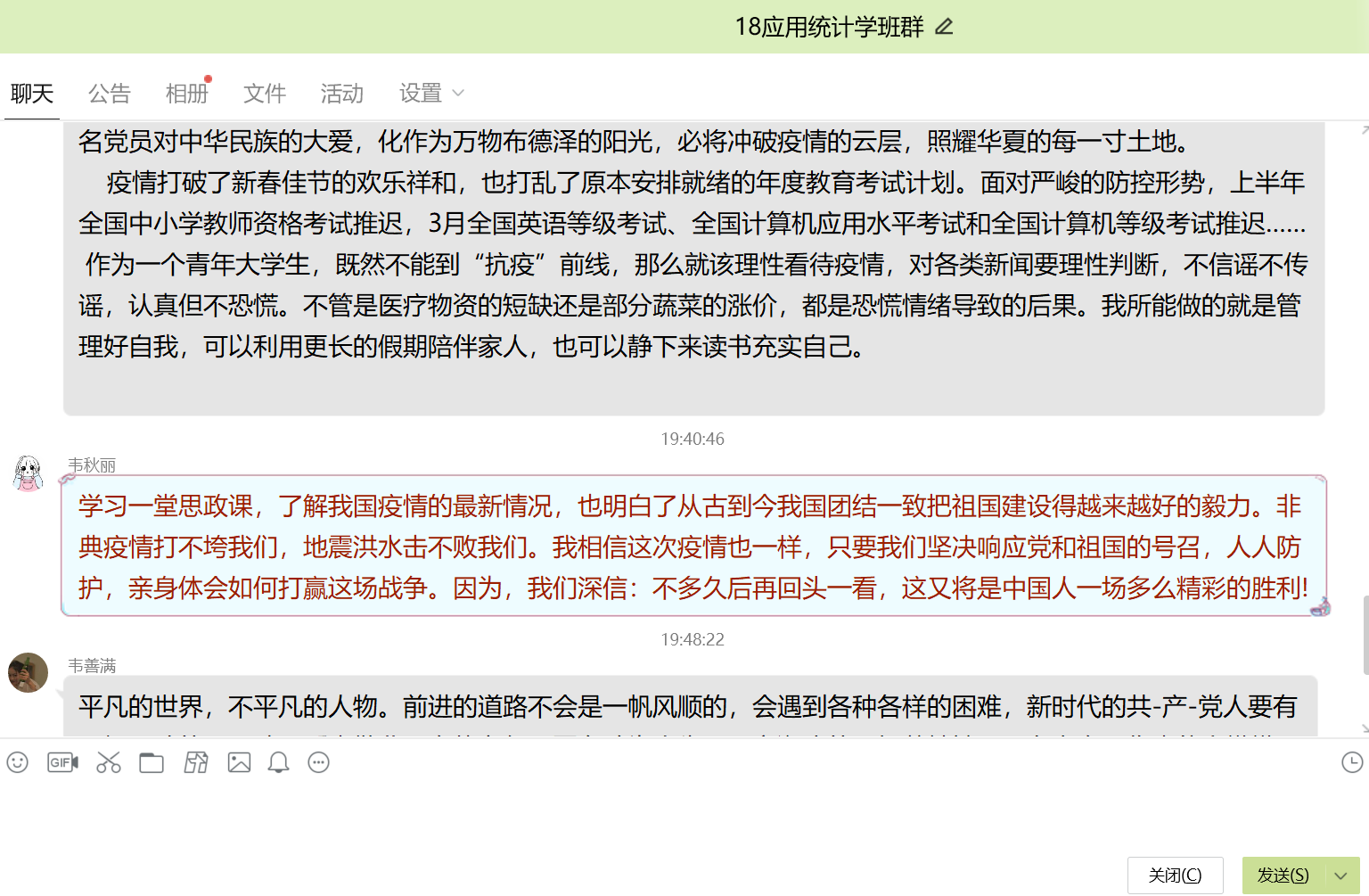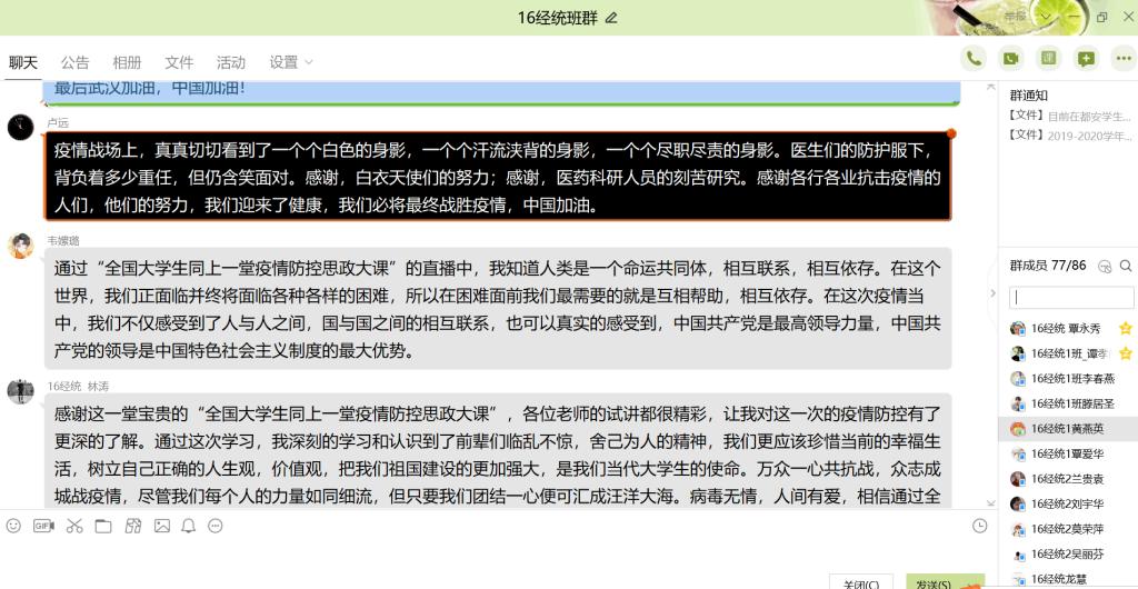 2017级应用统计班贺倩同学说:“在这一堂全国大学生思政课中,我受益匪浅,深刻地体会到伟大地祖国在防疫过程中地英明决策与巨大牺牲,也认识到我们与祖国的发展息息相关。习近平总书记在致全国青年学联的贺信当中曾指出:士不可以不弘毅,任重而道远。国家的前途,民族的命运,人民的幸福是当代中国青年必须,和必将承担的责任。作为一名大学生预备党员,我更要积极响应党组织号召,听从党组织安排,为此次战疫贡献一份绵薄之力。我相信,在全球中华儿女的共同努力下,终会打赢这一场战疫!”