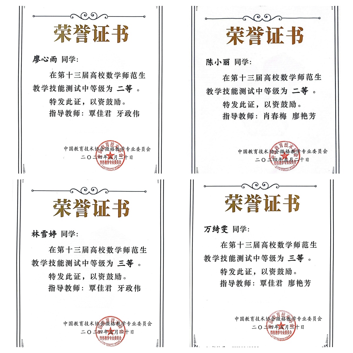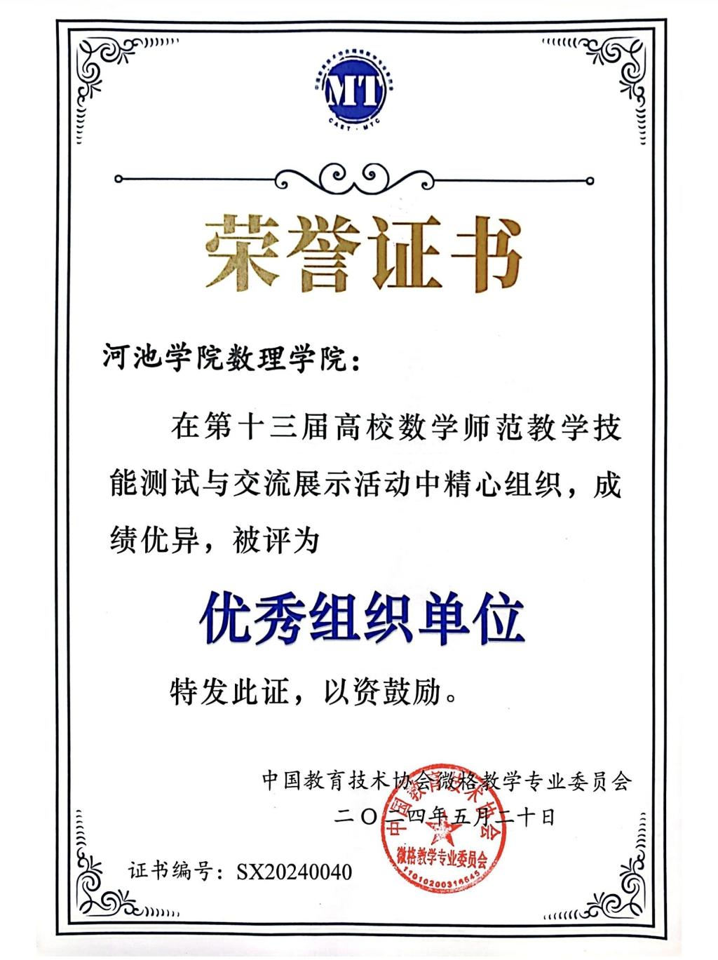 5月18日至5月20日,由中国教育技术协会微格教学专业委员会主办,2024年数学微格教学论坛暨第十三届高校数学师范生教学技能测试与交流展示活动在广西师范大学育才校区举行。本次活动由肖春梅教授带队,在“数学微格教学技能测试”中,我校参赛选手廖心雨、陈小丽荣获二等奖,林雪婷、万绮雯荣获三等奖,新葡萄8883官网AMG荣获优秀组织单位。