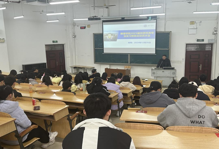 为全力推进2025届毕业生的实习与就业工作,引导毕业生树立正确就业观念,推进学院毕业生就业工作,12月26日下午,新葡萄8883官网AMG在格致楼负102教室召开2025届非师范类专业实习暨就业动员大会。会议由学院辅导员田茂才老师主持,学院党委副书记石宁、统计系主任陆尚辉、信计系副主任磨峰、全体辅导员以及毕业班班主任出席会议。
