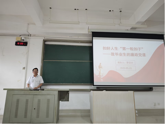会上,全体师生共同观看了《零容忍》《反腐为了人民》等廉洁教育专题片。随后,罗日才书记以《扣好人生“第一粒扣子”》为题,从“廉政内涵解读”、“职场风险防范” 、“廉洁从业实践”三个维度展开讲授。他结合典型案例,深入浅出地阐述了廉洁自律对国家、社会、家庭及个人的重要意义,强调毕业生要时刻保持清醒认识,自觉抵制各种诱惑。罗书记特别指出,党员毕业生要充分发挥先锋模范作用,始终做到“三个坚持”:坚持修身正己、坚持慎独自律、坚守廉洁底线。他寄语全体毕业生:“希望你们始终心怀敬畏,永葆清廉本色,用实际行动践行新时代青年的责任担当。”