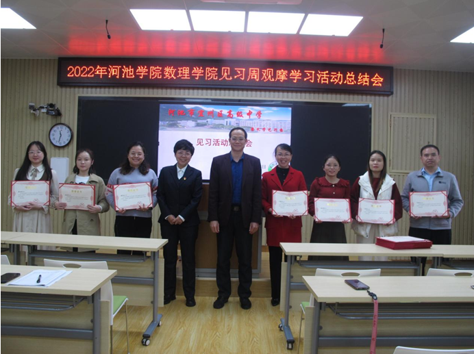 总结会上,各小组同学首先派代表发言,分享自己在见习活动的收获,总结了自身教学方面存在的问题和应该改进的地方。接着,尹向宝对宜州区高级中学支持本次见习活动表达了感谢,对宜州区高级中学优秀教师们丰富的教学经验和教学技能表示了赞许,并向他们颁发了荣誉证书。随后,宜州区高级中学教师代表蓝涓文发言,她老师对同学们认真听课学习的表现表示肯定,并期望能在未来的学习中能充分利用这次见习活动积累的教学经验,更上一层楼。最后,罗荣波副校长讲话,他希望见习生能继续努力,强化教师专业知识学习和技能训练,毕业后能加入宜州区高级中学这个大家庭里来。