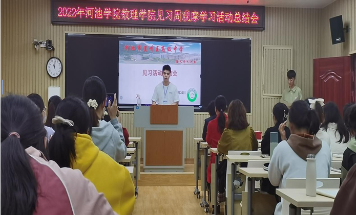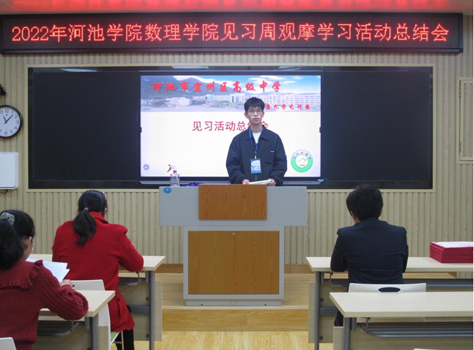 见习是数学与应用数学专业一个重要的实践性教学环节,为了更好地实现理论知识与专业技能的结合,进一步固化见习活动成果。11月25日,在宜州区高级中学举办新葡萄8883官网AMG见习周观摩学习活动总结会,宜州区高级中学副校长罗荣波、新葡萄8883官网AMG副院长尹向宝、新葡萄8883官网AMG数学系副主任王贵英以及宜州区高级中学教师代表、新葡萄8883官网AMG全体见习生出席本次会议。