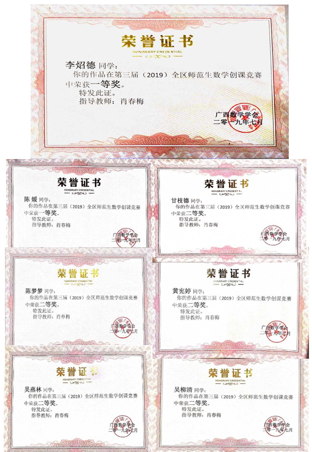 据悉,此次大赛共有来自全区10余所院校数学专业师范生参赛。此次大赛设置了数学创课设计和数学创课展示两个比赛项目,其中数学创课展示包括展示创课设计特色与亮点、阐述设计的意图与理由、专家提问选手答辩等环节。我校7名选手在数学与统计学院副院长肖春梅教授的指导下,经过赛前严格的训练,和比赛中良好的发挥取得了优异成绩。其中李炤德、陈媛荣获全区创课大赛一等奖,甘枝德、黄宪婷、吴燕林、陈梦梦、吴柳清荣获全区创课大赛二等奖。